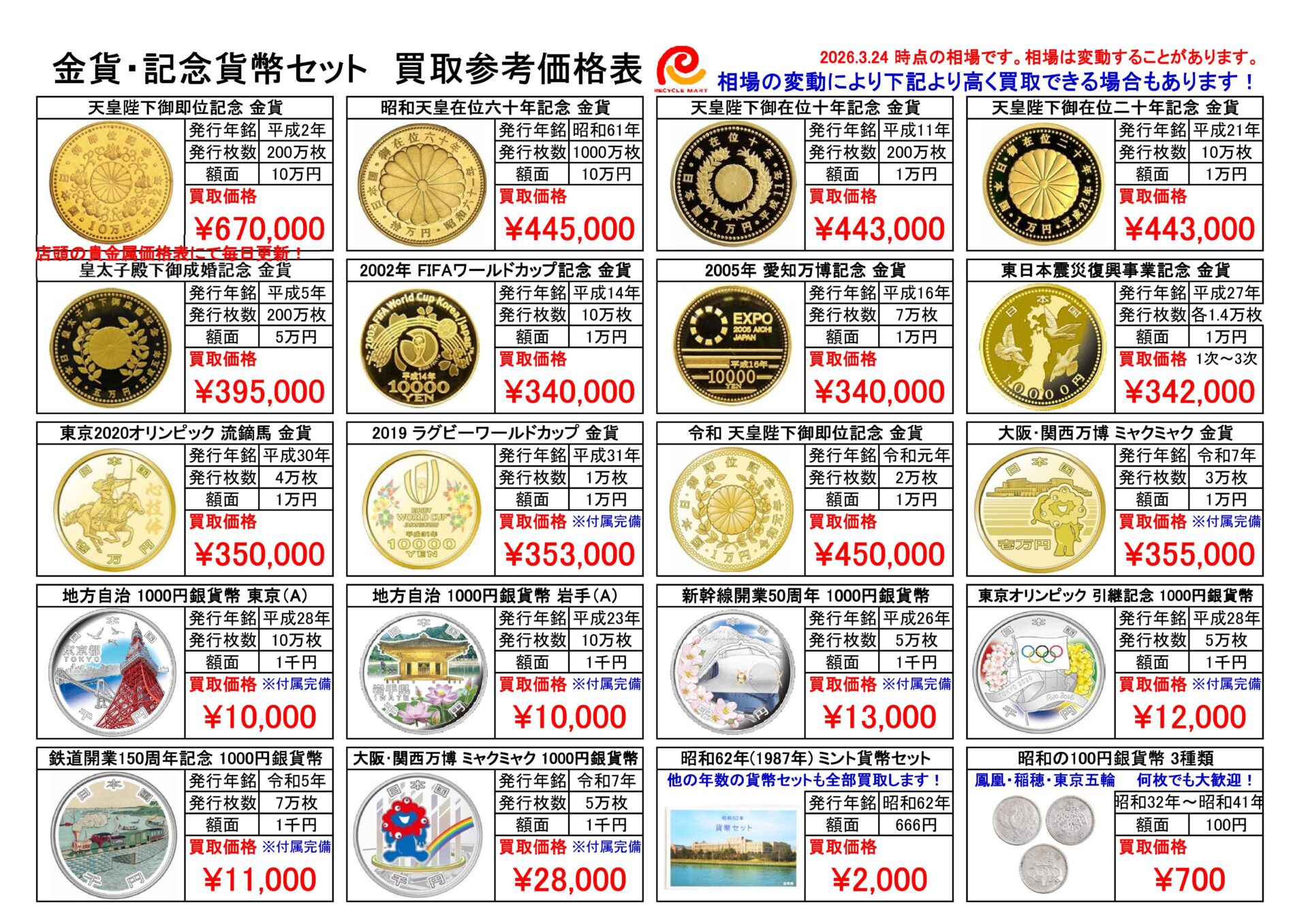 【金貨・記念貨幣 買取価格表】